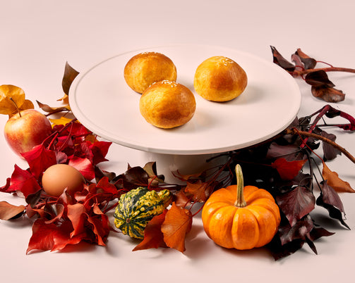 Apple, Pumpkin, milk, avocado oil, bread flour, yeast, egg, egg yolk, white sesame